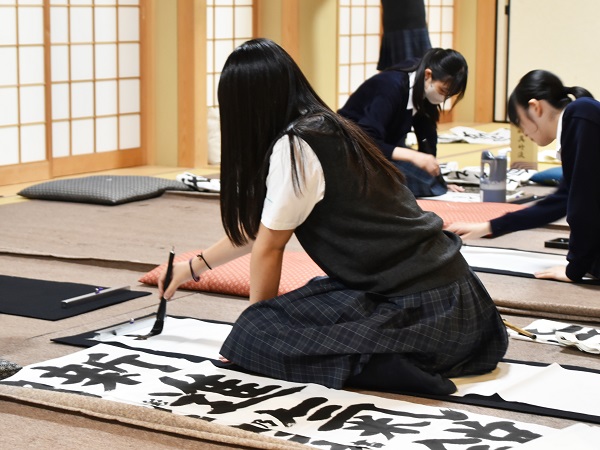先輩部員たちは後輩を指導しつつ、高2生は新しい書体への挑戦を始め、高3生は書道部員としての集大成の念を込めて書に勤しんでおります。