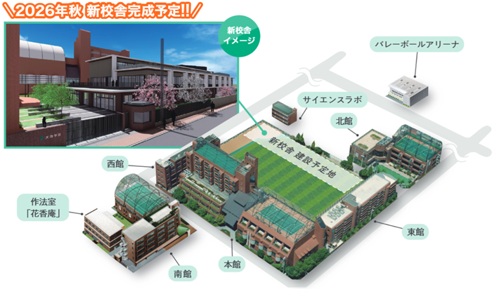 人工芝グラウンドやホール、食堂をはじめ、大阪府最大級の広さを持つ音楽室(吹奏楽部合奏室を兼用)など、整った施設・設備のなかで充実したスクールライフを送ることができます。また、作法室「花香庵」や学内コンビニエンスストアなどもあり、様々な場面で活用されています。